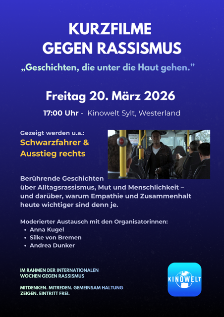 Unter dem Titel „Kurzfilme gegen Rassismus“ werden auf Sylt, innerhalb der internationalen Wochen gegen Rassismus mehrere preisgekrönte und bewegende Kurzfilme gezeigt, die sich mit Alltagsrassismus, Vorurteilen und Zivilcourage auseinandersetzen.